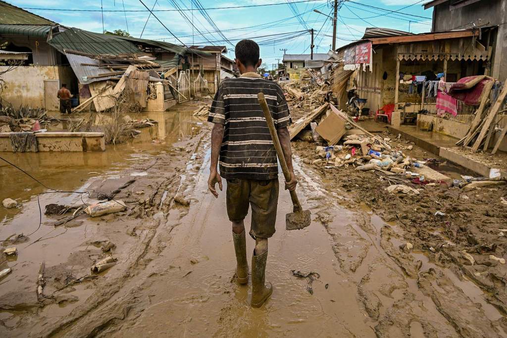 当地时间2025年12月6日,印度尼西亚亚齐省亚齐塔米昂,一名男子走在被山洪淹没后仍泥泞的街道上。视觉中国 图
