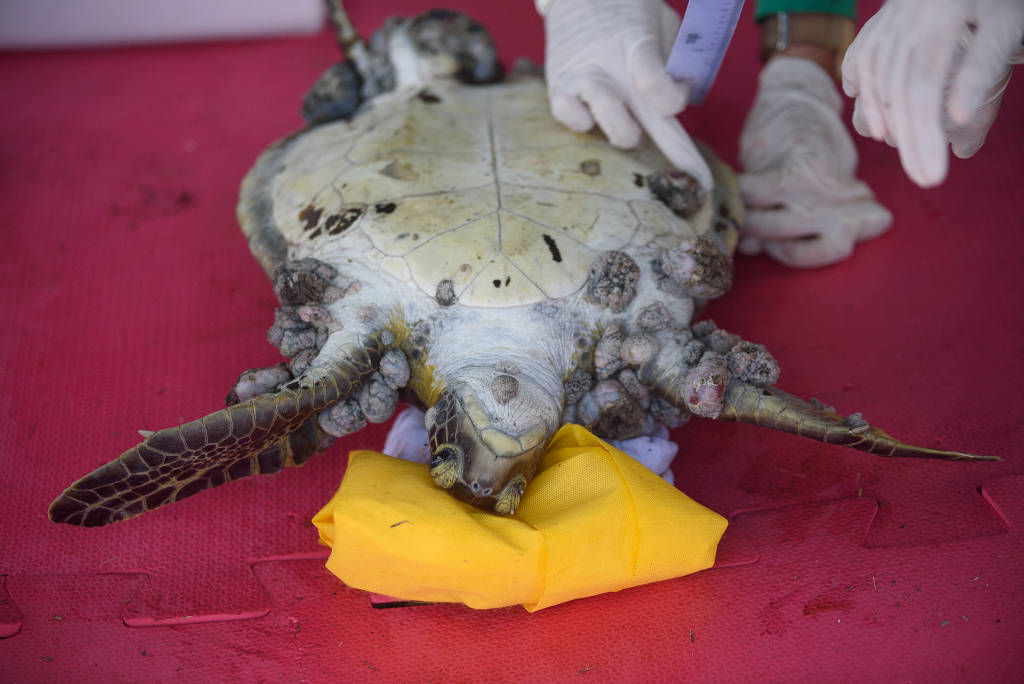 当地时间2025年9月18日,巴西里约热内卢,生物学家正在护理濒危的绿海龟。由于污染,许多海龟身上长有肿瘤。海龟因人类活动(如捕鱼时的意外捕获、污染(尤其是塑料污染)、筑巢栖息地被破坏和气候变化)而面临灭绝。视觉中国 图