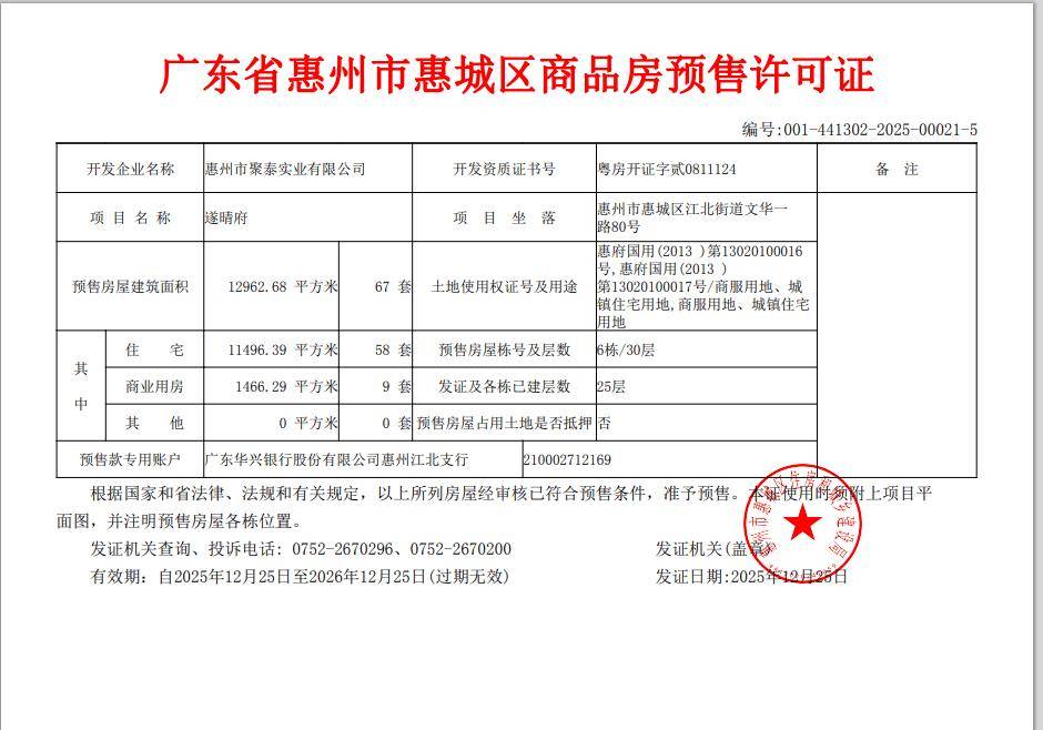 12月25日,惠州江北中盛遂晴府获得预售证,首推6号楼,共有58套住宅。备案价格区间约2.2万-2.6万元/㎡,整体备案均价约为2.4万元/㎡。