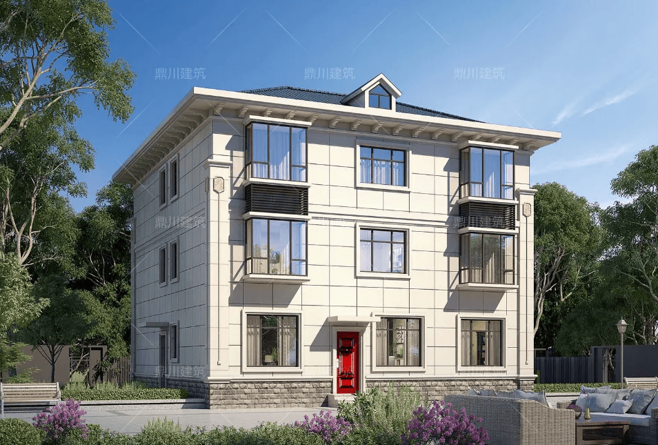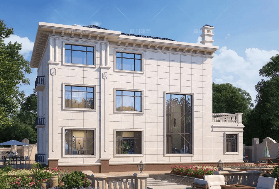 新中式三层别墅,别墅外墙大面积使用白色真石漆,搭配黑色屋顶更显沉稳,坡屋顶设计,既美观又防水;房屋前后开大窗,室内明亮通透,光线充足通风好。二三层有露台,方便赏景乘凉和日常晾晒。