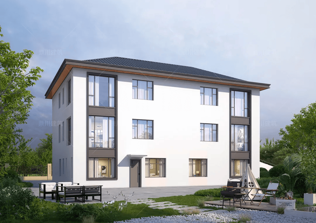二层新中式风格,砖混结构,主体对称构筑,右侧设独立偏房,左侧还有一个一层。整体色调沉稳大气,白色主墙体搭配灰色坡屋顶,尽显古朴秀雅,地基部分则用仿大理石砖铺面,防腐防潮,同时抬高地基防止雨水倒灌。四面多窗设计,保证室内充足采光与良好通风。