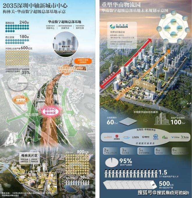 华南数字超总规划占地约60万平方米,以产、学、研、住、休一体化自循环空间规划,计划引入世界500强企业进驻(目前世界500强企业【海克斯康】已落户于此,已集聚35+龙头名企,数字产业集群度达95%),将打造成为继腾讯企鹅岛、深圳湾超级总部基地、香蜜湖之后深圳第四大微城市,涵盖人工智能、5G技术、工业互联网、云计算、智能终端、新能源等高密度数字集群产业,未来可吸纳约1.5万个高新科技产业人才、年产值将达到500亿元。