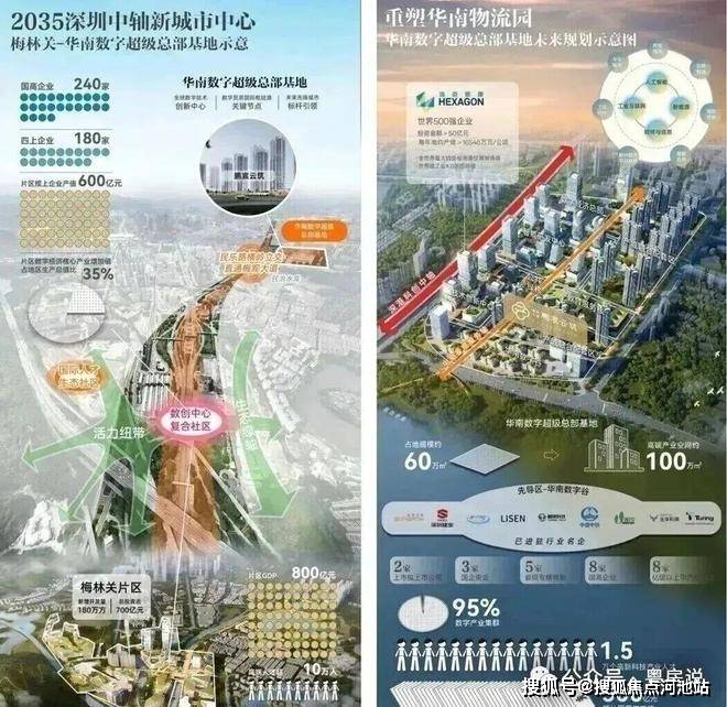 (1)梅林关|“深港科技中轴”重要战略支点,近700亿投资梅林关是以交通枢纽、产业集群、商业核心与科教人文为战略规划的世界级“中央活力生活区”,2024年10月,龙华区正式官宣:梅林关片区将全面对标纽约哈德逊城市广场、巴黎拉德芳斯区,打造一座“垂直立体的轨道上盖之城”,总投资规模近700亿元,由中建三局集团有限公司深度参与整体开发运营,将梅林关打造为“大湾区数字经济核心引领区、数字科创先锋示范区”,改造范围约4.63平方公里,预计新增开发量180万平方米,推动片区年总产值突破1500亿元,创造近6万个高端就业岗位