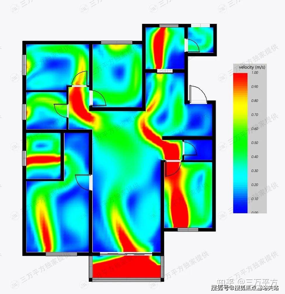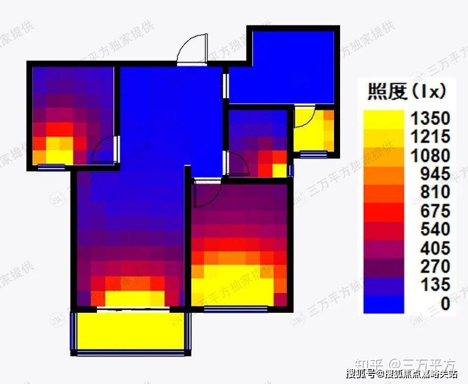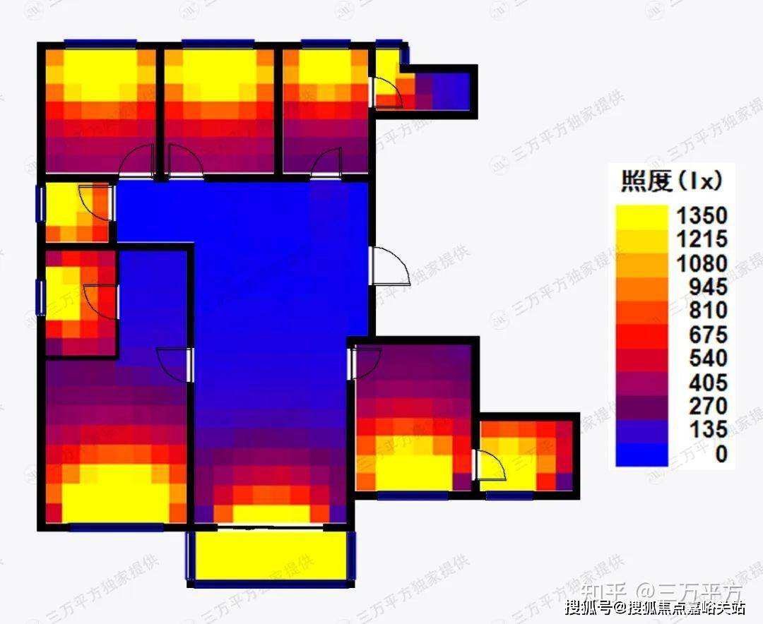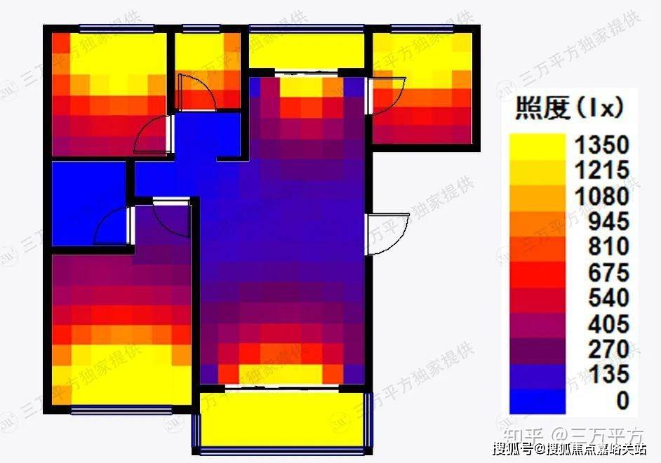 我们测算了该户型的通风采光条件,由采光图可以看出,开窗的房间基本上都能获得较好的采光,而中央区域由于进深很大,获得采光的能力很弱,需要人工照明;同样是南北通透户型,该户型由于门窗设置的位置不是特别好,风在房间内不停改变方向又无法及时排出,导致不能形成很好的穿堂风效果,通风效果比较一般。(图例数值越大代表户型通风采光效果越好)