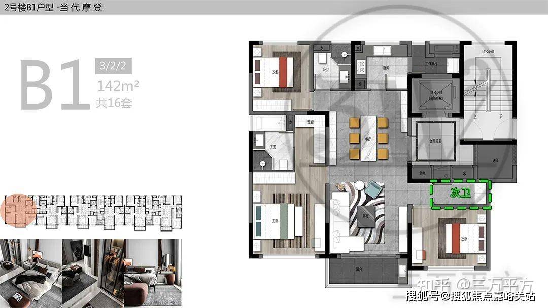 户型位于2#楼中户位置。户型布局和B1 142㎡户型基本相同,南侧次卧旁的储藏间后续可改成卫生间,进而增加一个套房,整体近三个套房设计,使用起来相当舒适。