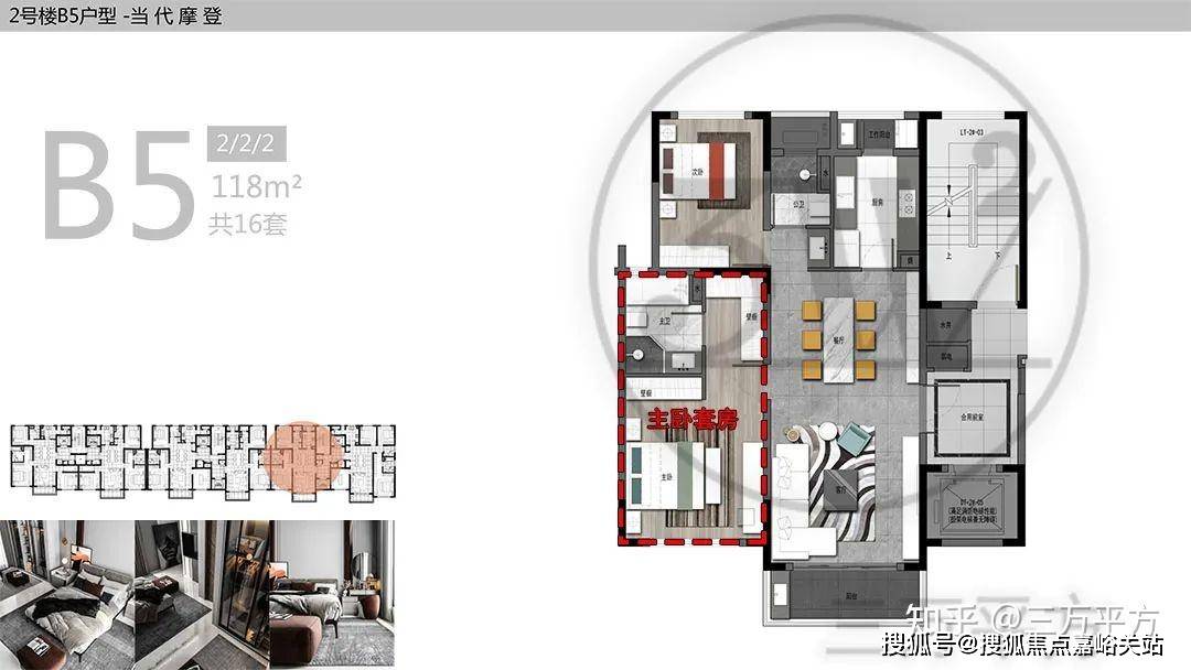B4 119㎡户型与B5 118㎡户型基本上相同,都是位于2#楼中户位置。两室两厅两卫,两开间朝南,南北通透户型,采光很好。主卧套房空间很大,实际使用很舒适。