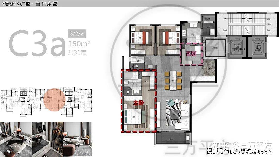 C3 150㎡户型与C3a 150㎡户型基本一致,都是位于3#楼中户位置。三室两厅两卫配置,南向两开间,南北通透,采光很好。厨房带工作阳台,而且有西厨空间,使用很舒适。主卧空间宽敞,有相对独立衣帽间,主卫四件套配置还算可以。