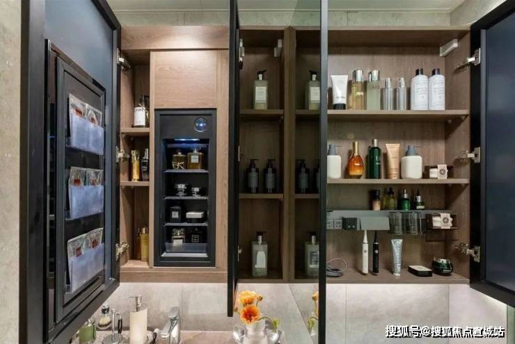 项目主卫的镜柜内设计了 美妆冰箱和集成柜 ,不仅可以更好地贮藏名贵化妆品,而且也是更合理的化妆动线设计。