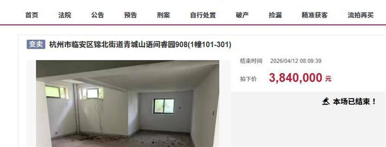 尊龙凯时,尊龙凯时官方网站,尊龙凯时APP下载不到一万元一平,就能在杭州拥有一套带大花园的三层大别墅? 这不是天方夜谭。 2026年4月11日,杭州市临安区锦北街道“青城山语间睿园”一套建筑面积465.41平方米的毛坯别墅,在司法拍卖平台上以384万元的起拍价成交。 评估价高达685万元的资产,最终成交价直降301万元,相当于打了5.6折,折合单价仅8251元/平方米。 整个拍卖过程只有一位报名者,没有发生任何竞价,这位买家以底价轻松将其收入囊中。